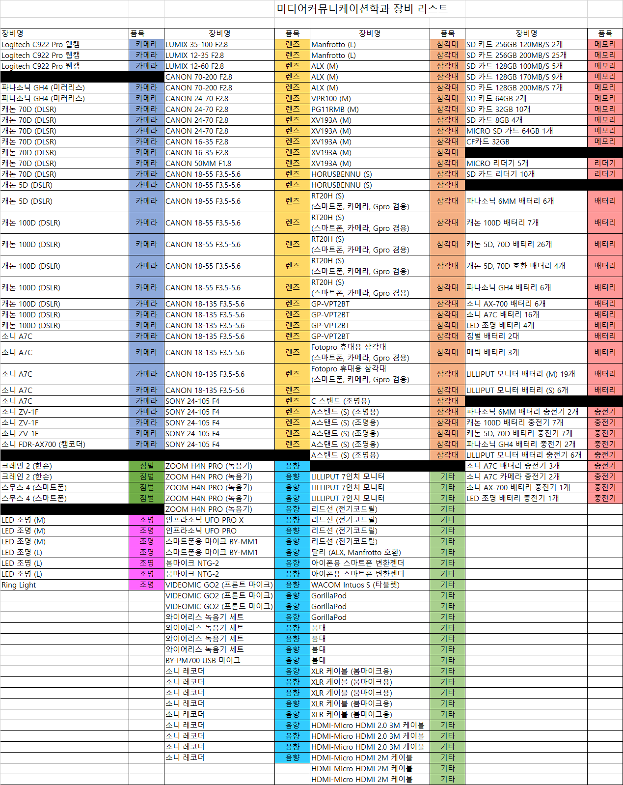 신문방송학과 현재 구비된 장비 리스트입니다. 궁금하신 사항은 장비실 근로학생에게 문의해 주시면 감사하겠습니다.